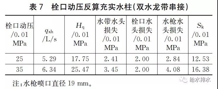 以修正后的公式,按規范規定的栓口動(dòng)壓反算充實(shí)水柱,分單水龍帶和雙水龍帶串接2種情況,計算結果見(jiàn)表6、表7。