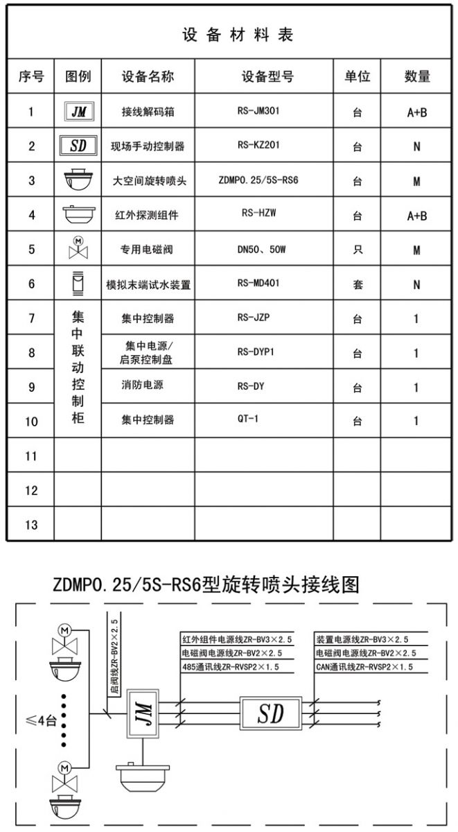 在被保護區域內共設置M臺大流量旋轉噴頭(型號ZDMP0.25/5S),信號解碼箱安裝應與紅外探測組件距離不超過(guò)10米,電磁閥宜水平安裝。大空間旋轉噴頭現場(chǎng)區域控制器安裝在噴頭下方附近,距地面1.5米壁裝,操作時(shí)應能看清其動(dòng)作;設備安裝高度見(jiàn)平面圖,設備型號參見(jiàn)材料表。